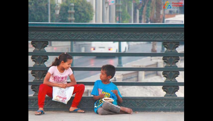a child is waiting for his sister to bring him his favorite meal which consists of a loaf of bread and a piece of chicken. This photo was taken to document innocence on Qasr El Nile bridge.